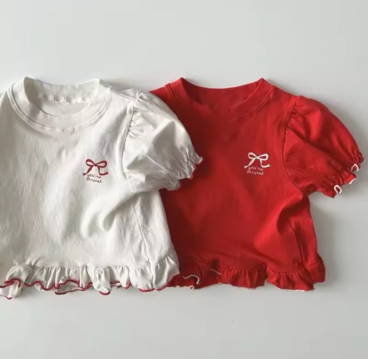 可愛らしいパフスリーブリボンTシャツが新登場です!このTシャツは、柔らかな素材を使用しており、着心地がとても良く、デイリースタイルにぴったりな一枚です。